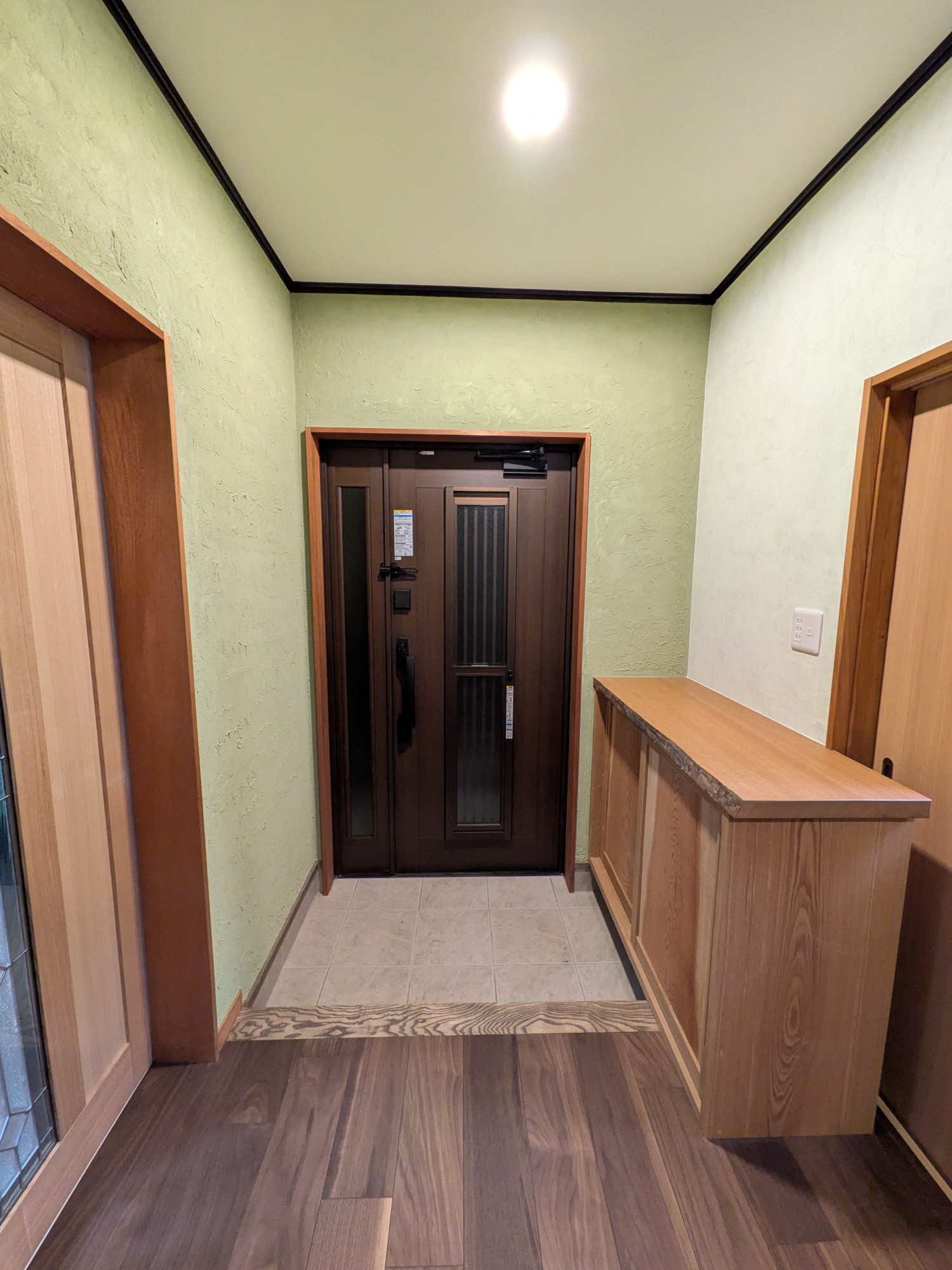下駄箱を解体し新たに造作。天板、側板の材料はタモ材。天板は耳付きの1枚板。