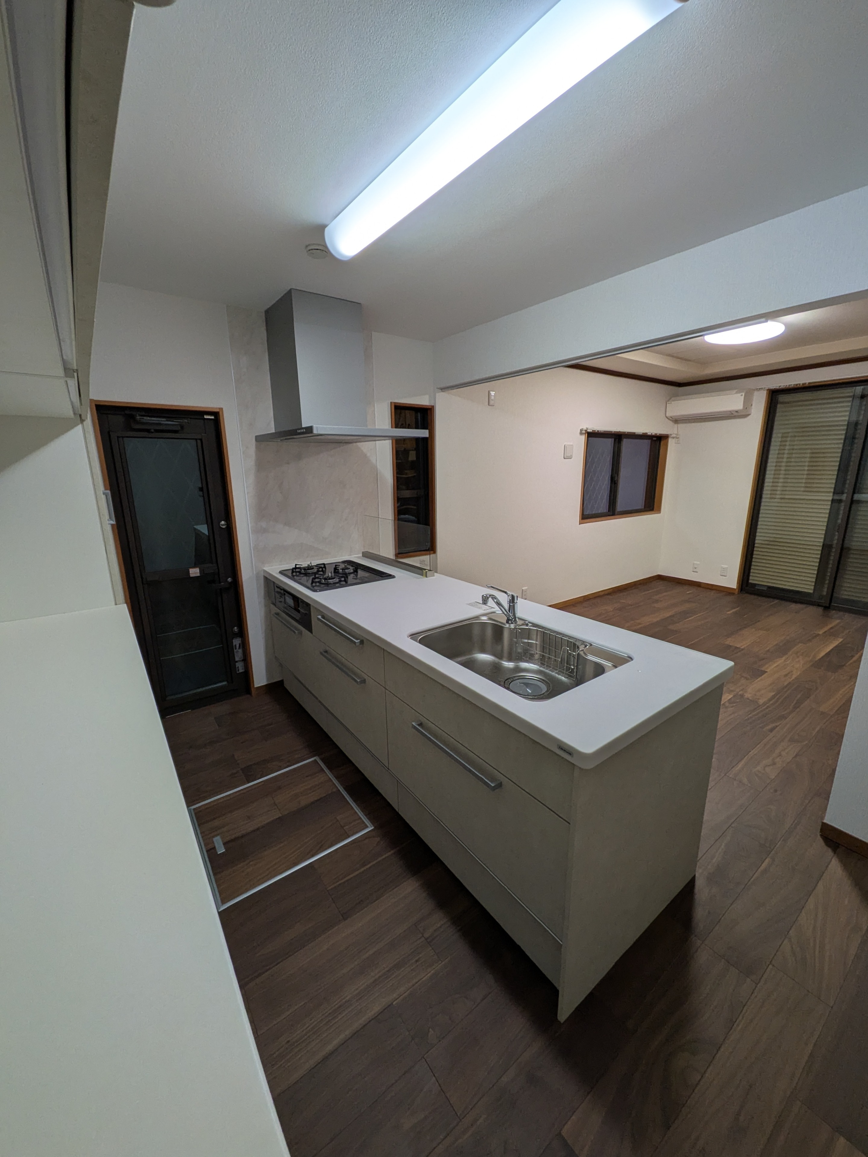 まずはキッチン。クリナップラクエラ。ダイニングとの間にあった袖壁を解体を梁を入れて補強しました。ダイニングとの一体感をだしました。