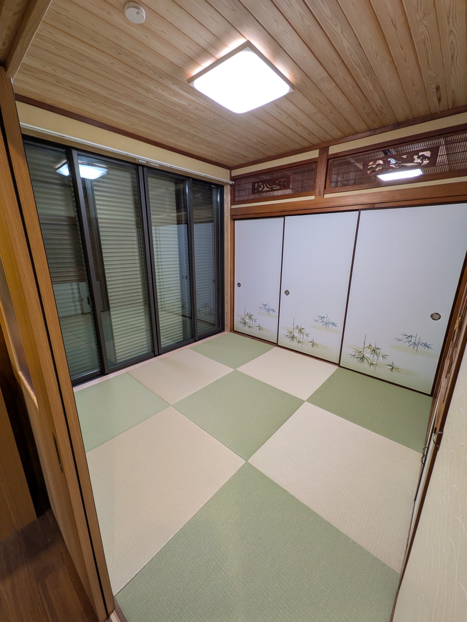 和室天井を竿縁天井に。床をフローリングにしサッシをシャッター付きに。